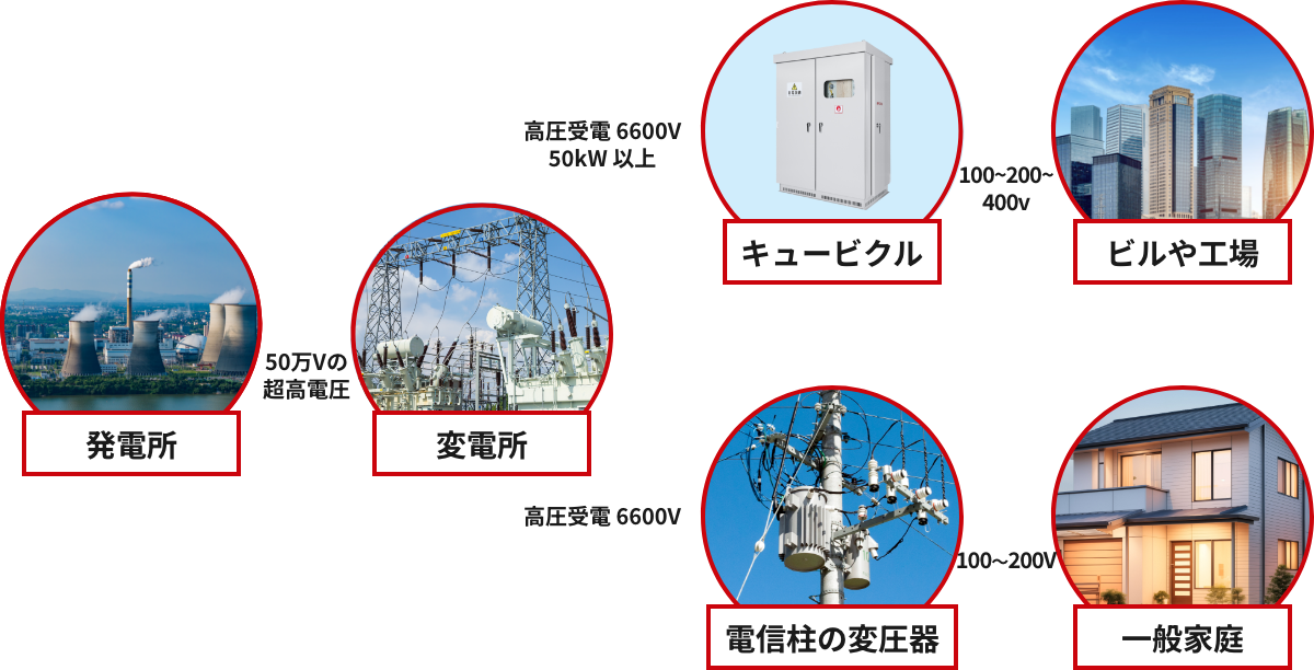 一般家庭では100~200ボルトで十分ですが、工場や大型施設では、一度に多くの電力を必要とするため、